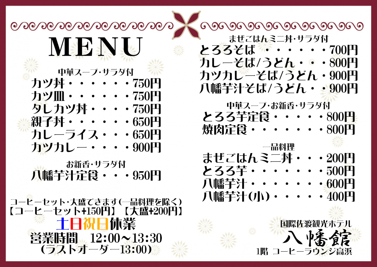 只今1階にございますコーヒーラウンジ高浜では平日限定ランチタイムが好評営業中でございます